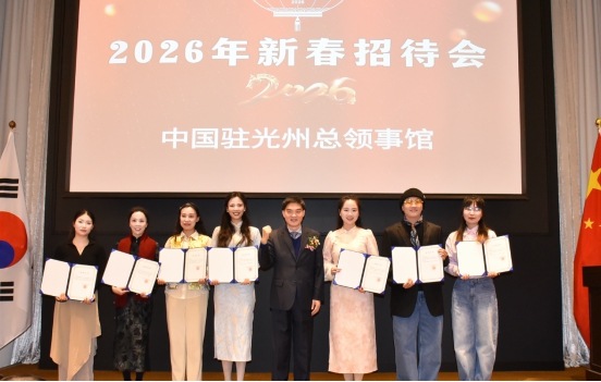 招待会在庄严的奏唱国歌仪式中拉开序幕。顾景奇总领事向全体来宾致以新春祝福,回顾了2025年中国经济社会发展成就,介绍了中韩两国元首互访的重要成果及领区对华交流合作情况,并对各界人士为推动中韩交流合作所作贡献表示衷心感谢。顾总领事强调,2026年总领馆将继续与各界携手,共同推动中韩关系持续健康发展。与会嘉宾纷纷表示,愿继续发挥桥梁作用,助力中韩各领域合作迈向新台阶。