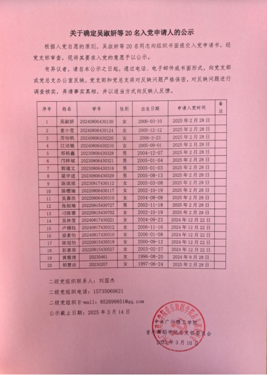 关于确定吴淑妍等20名同志为入党申请人的公示