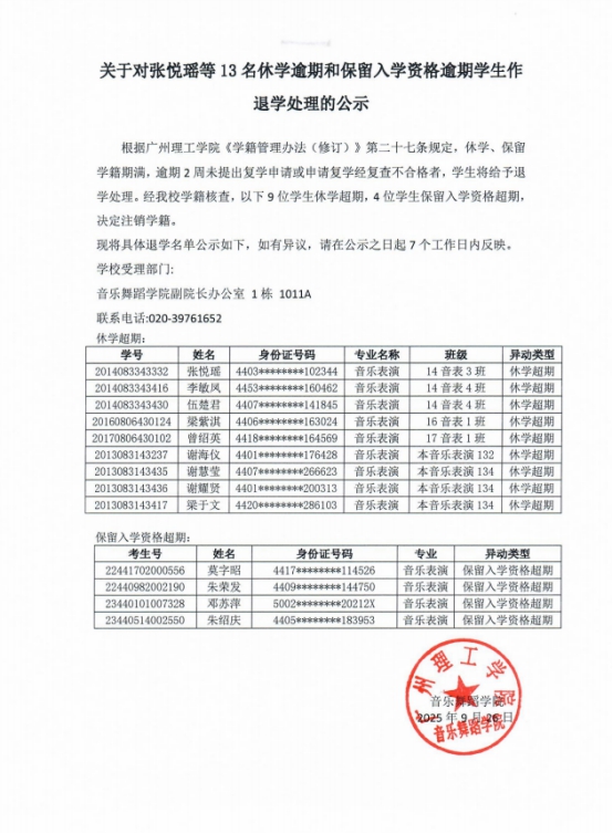 关于对张悦瑶等13名休学逾期和保留入学资格逾期员工作退学处理的公示