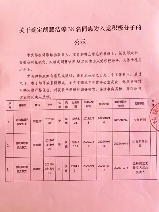 关于确定胡慧洁等38名同志为入党积极分子的公示