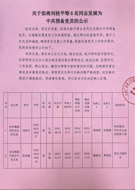 关于拟将刘桂平等6名同志发展为中共预备党员的公示