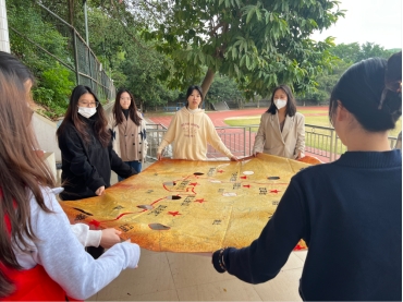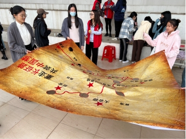 本次游戏活动的名称为《重走长征路》参与人数6-8人为一组,游戏所准备的画布上已经有“中央红军长征前期准备路线图”的图样,在地图“瑞金”地点放置一网球,代表中央红军,最先到达“延安”的小组获胜。小组成员们共同控制画布的高度和方向,齐心协力,拧成一股绳,这不仅为成员之间增添了默契度,也拉近了彼此的距离和培养了我们的团队意识和协作能力。