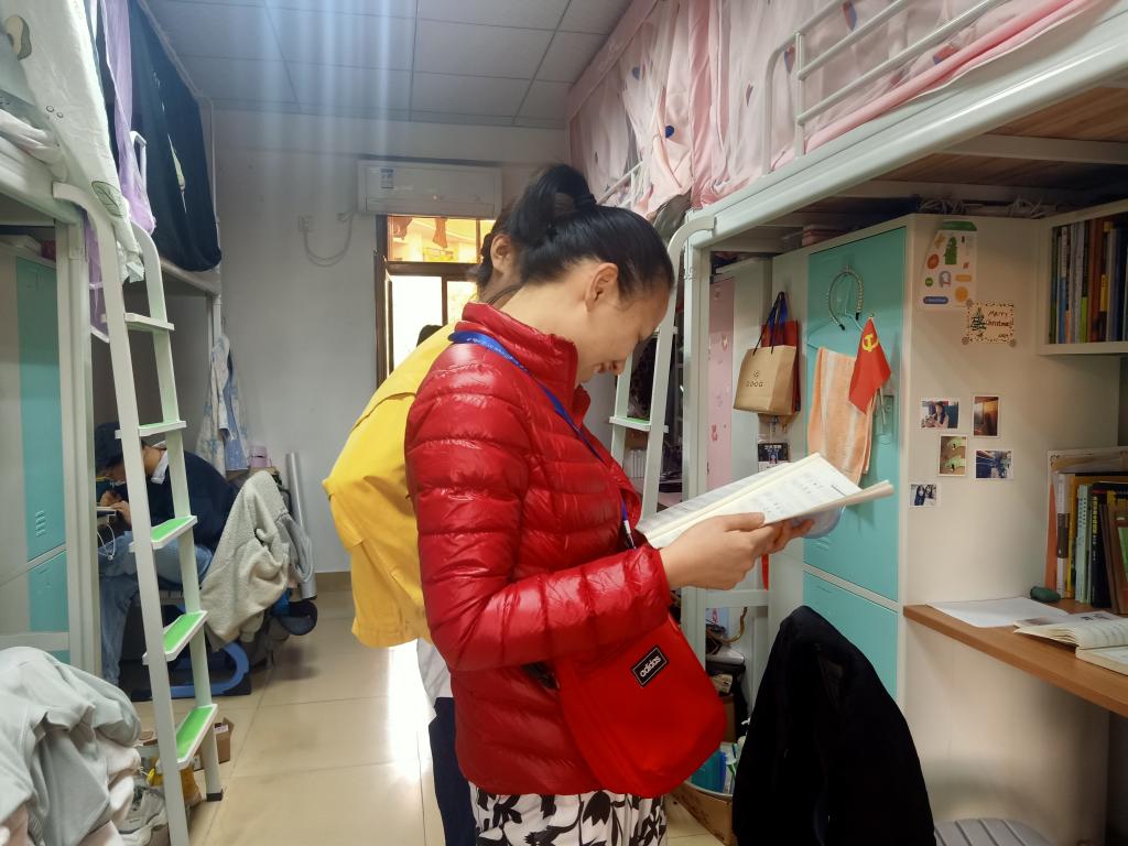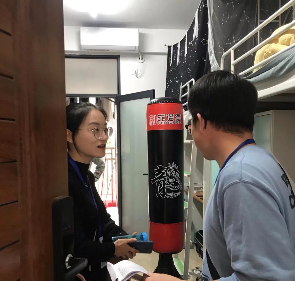 在走访员工宿舍的过程中,辅导员老师认真地检查宿舍的生活环境,就其中的安全隐患问题做了详细的记录,并及时反馈当事人敦促整改,反复强调人走灯灭、不用电时关闭电源,减少安全隐患。各位老师结合自己年级的工作,从入学适应、专业学习、求职考研、防诈防骗等方面和员工们进行了详细的交谈,对员工们日常生活中遇到的困难和需求给予了意见和反馈。