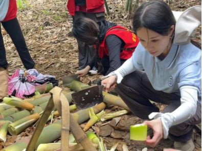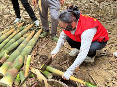 老师们与突击队队员们学习并协助笋农进行竹笋砍摘