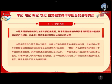 (薛珈莹)为加强员工党支部的纪律建设,引导员工党员真正把纪律规矩转化为政治自觉,思想自觉和行动自觉,公司员工党支部于2024年7月14日下午组织全体员工党员线上开展纪律党课。公司员工党支部书记潘栩涵出席本次会议,全体员工党员参会学习。此次学习会由杨嘉华同志主持。