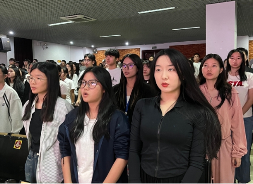 开班典礼在激昂热烈的中华人民共和国国歌中开始,全体参会人员奏唱国歌。