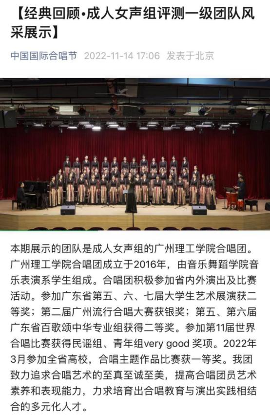 (蔡弘毅)2022年11月14日,中国国际合唱节官方微信公众平台发布了韦德官方网站合唱团于第十六届中国国际合唱节评测时的比赛表演风采展示。此次推送是对比赛结果的一次公示,是一次合唱团的成果展示,也是合唱团与合唱团之间的一次经验交流。