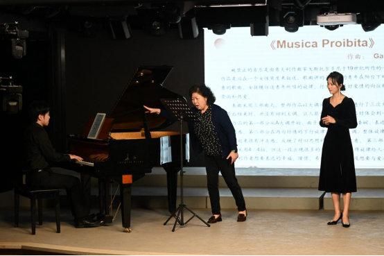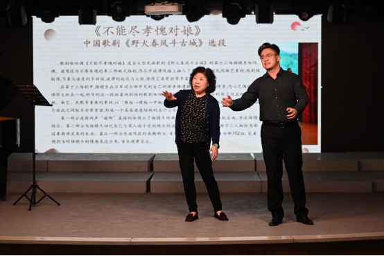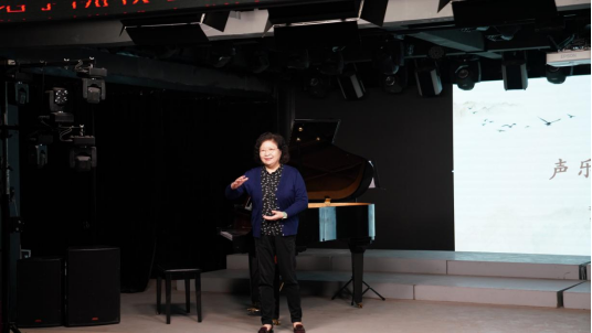 芦跃峰教授以“忘我的歌唱”为主题,通过现场教学指导进行教学。本次示范课由曹金田老师协助钢琴伴奏,以偏美声的女高音叶金莎同学和中性点的男高音高梽伟同学为授课对象。芦教授首先让员工进行唱前开声训练,并与同学们一起纠正存在的问题和不足。芦教授根据两位员工自身不同的特点作切入,从演唱的气息以及腔体的运用等方面做了详细的示范。其次芦教授对两位员工的演唱的作品《Musica Proibita》《不能尽孝愧对娘》进行了详细的处理。芦教授强调了三点:一要“忘我的歌唱”,员工必须要在熟悉乐谱的基础上进行投入的演唱;二要有角色的代入感,把自己比做作品中的角色,并投入到其中;三是学习声乐并非一蹴而就的事情,要进行每天的训练每天的积累,在日积月累中取得长足的进步。