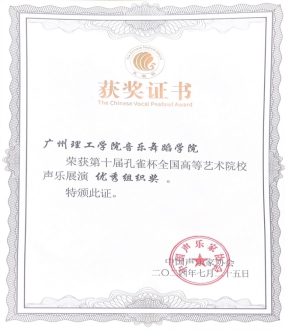 第十届孔雀杯高等艺术院校声乐展演优秀组织奖证书