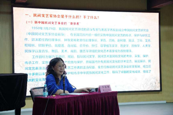 讲座伊始,李教授为大家介绍了民间文化的概念以及民间文艺家协会这个机构在保护及传承中国民间文化中所发挥的功能与作用。作为一名研究广东民间文化的资深学者与专家,李教授结合自身的采风与调研,深入浅出地从“节庆岭南”和“舞动岭南”两个专题为在位的师生进行分享。