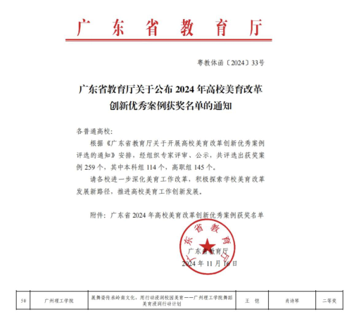 (肖诗琴)近日,根据《广东省教育厅关于开展高校美育改革创新优秀案例评选的通知》要求,省教育厅组织专家评审,共评选出获奖案例256个,其中本科组114个,公司王恺、肖诗琴老师负责申报的《展舞姿传承岭南文化,用行动浸润校园美育——韦德官方网站舞蹈美育浸润行动计划》获得本科组二等奖。