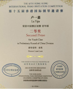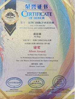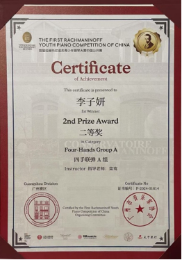 (栾鸾)近日,从第十一届澳门国际艺术公开赛赛场传来喜讯,22音表9班(Z)的陈欣童同学凭借其卓越的艺术才华和精湛的技艺,在众多参赛选手中脱颖而出,一举斩获金奖,莫诗琪同学斩获二等奖;由广州市音乐家协会举办的首届拉赫玛尼诺夫青少年钢琴大赛中国公开赛中,来自22音表1班的李子妍同学获得二等奖;在第十五届香港国际钢琴邀请赛中,22音表8班(Z)的卢一嘉同学、22音表5班(Z)的杨思晴同学表现出色,荣获二等奖。