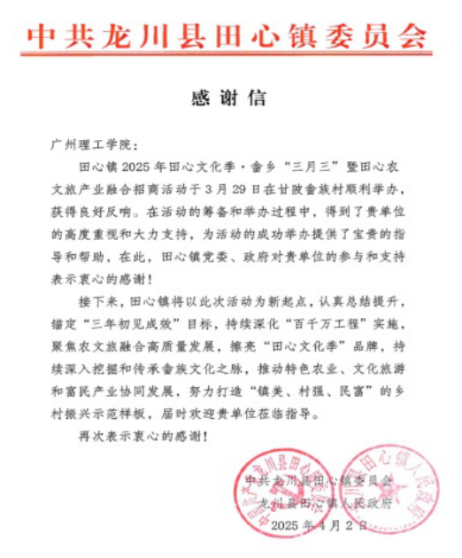 中共龙川县田心镇委员会感谢信图片