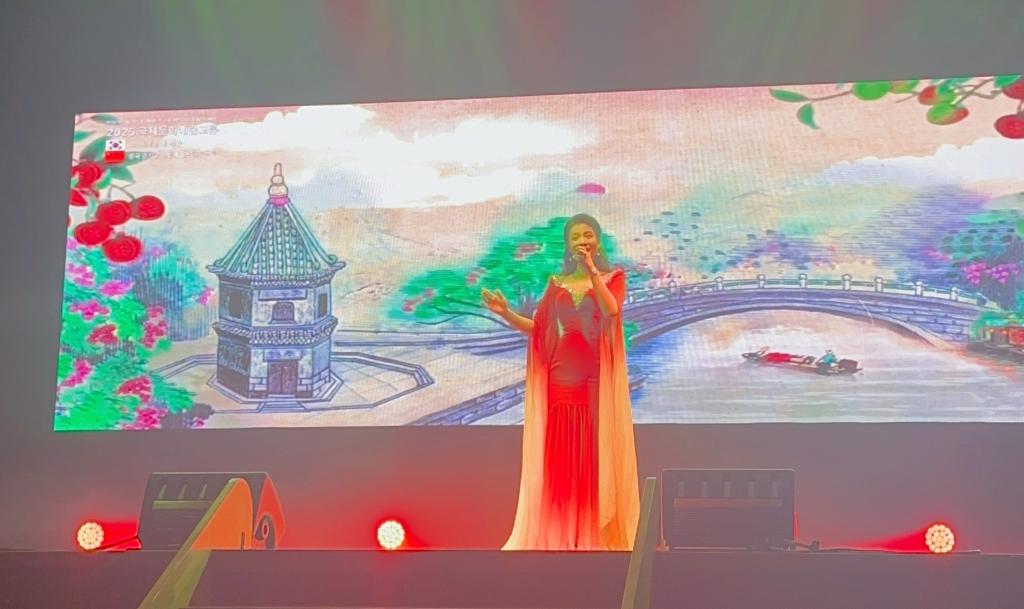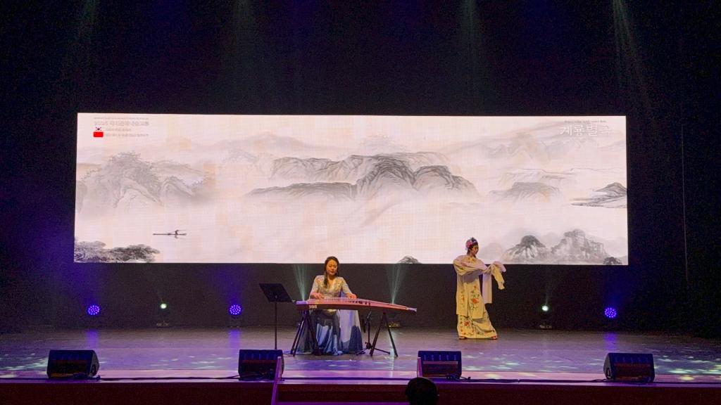 当晚以“鸡龙别曲”为主题的 2025国际文化艺术交流晚会盛大启幕。鸡龙市市长李应雨、忠清南道道议员李载云、鸡龙市议会议长金犯圭等当地政要以及国防产业研究院李忠鎬经理、鸡龙市文化院经理林英宇、鸡龙市体育会会长郑俊永、鸡龙市议员金美贞、鸡龙市议员张龙德、鸡龙市议员申东元、鸡龙市议员李元珠、全北中国人协会朱春梅会长,全北中国人协会刘译骏副会长、青龙艺术团申惠庆代表悉数出席。整场晚会共呈现 11个精品节目,韩方青龙艺术团带来传统音乐合奏《南道巷歌》、传统剑舞《刀剑舞》《蝴蝶舞》《僧舞》等经典节目,尽显韩国传统艺术的典雅韵味。而韦德官方网站代表团献上的 6 个极具岭南特色的节目,更是成为晚会的高光时刻 —— 男团演绎的《席狮舞》气势恢宏,独舞《逐浪》灵动飘逸,古筝戏曲伴舞《高山流水》意境悠远,独唱粤曲《荔枝颂》韵味醇厚,《瑶鼓舞》热情奔放,《英歌舞》铿锵有力,每一个节目都赢得台下阵阵雷鸣般的掌声与欢呼声。