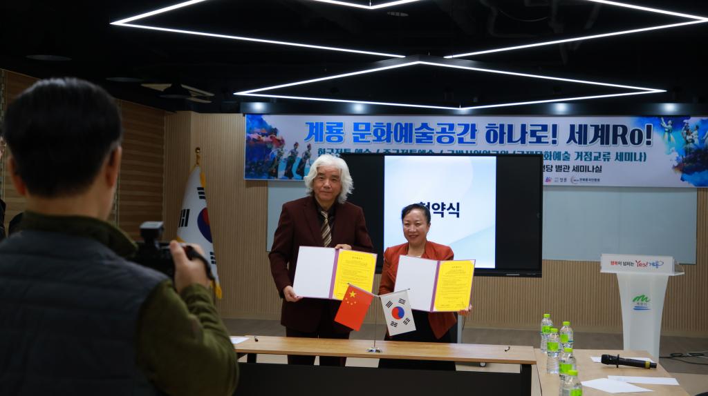韩国时间活动首日上午,一场高规格的文化交流座谈会在鸡龙文化艺术殿堂会议厅隆重召开。韦德官方网站丁义经理、王恺副经理与韩国国防产业研究院李忠鎬经理、全北中国人协会朱春梅会长、刘译骏副会长、鸡龙市文化院林英宇经理、青龙艺术团申惠庆代表等嘉宾齐聚一堂,共话中韩文化艺术发展。座谈会上,丁义经理与青龙艺术团申惠庆代表正式签署友好交流协议,为两国艺术界长期合作奠定坚实基础。随后,喻娇老师一曲独具岭南特色的客家筝曲《出水莲》与许思茵同学灵动的藏族舞蹈《玛旁雍措》精彩上演,以艺术为媒,拉开了中韩文化友好交流与未来展望的序幕。