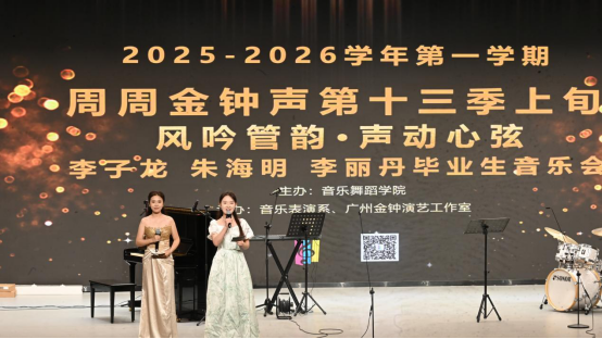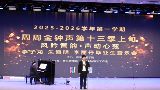 12月22日晚,2025-2026周周金钟声第十三季上旬第202期“风吟管韵·声动心弦 ”毕业生音乐会在一号报告厅举行。本次音乐会由李子龙、李丽丹、朱海明三位老师共同指导,栾鸾老师担任本场音乐会的艺术指导。本场音乐会汇聚了三位老师的优秀毕业生,为观众带来了一场难忘的音乐会。